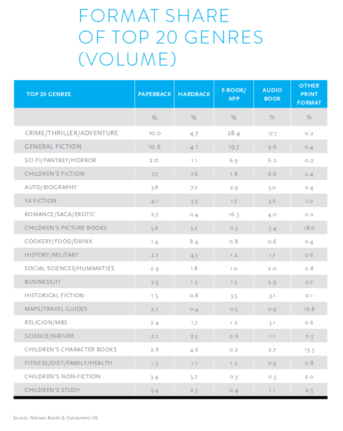 Nielsen figures for volume in the top 20 genres, show crime leading romance almost four-to-one in the UK in paperback and by a bit more than twice in ebooks and apps.